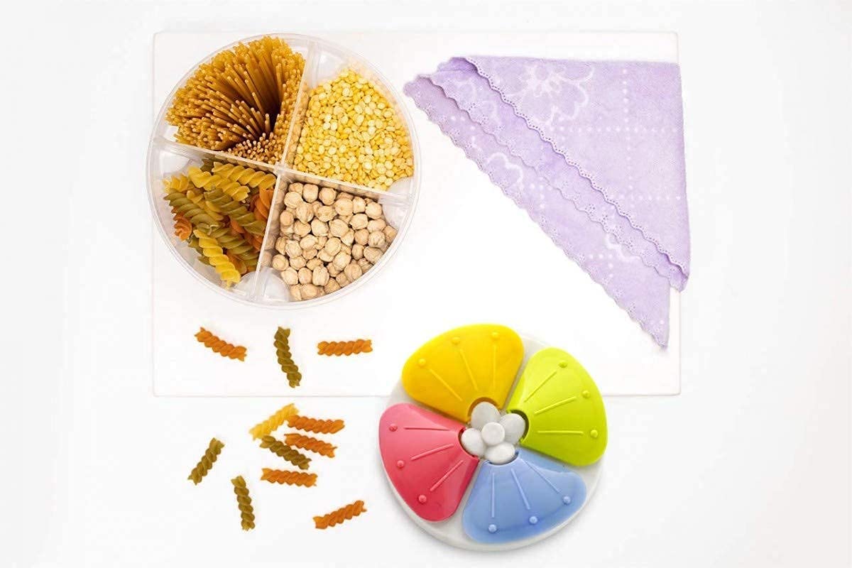 4 Section container is made from 100% food-grade PP plastic which is BPA-free. This airtight container is designed to be odor-free, thus keeping the aroma and taste of your stored items intact. You can store a variety of foods ranging from cereals, spices, dry fruits, pulses to salt, sugar, snacks etc. in the jars. This 4 Section container have individual 4 sections in one container, so that you can store 4 different food items in one container without mixing one with each other. There are 4 individual cells in a container. - They are ideal for storing a variety of foodstuffs - Simply stack in cupboard and fridge. - Keep your food separate and make your day colorful The section in 1 Jar:- Food Storage Jar with 4 sections. Keep 4 types of food in the same jar without mixing. Uses of Storage Jar :- Keep and store grains, pulses, cereals, flour, snacks, dry fruits, rice, pasta and more also ideal for storing dry foods such as flour, sugar, rice, grain, cereals, nuts, beans, snacks, coffee and tea and but they are also perfect for holding liquids such as water, juice, soup, and more Quality : This food storage jar is made from food-grade plastic. These air-tight food-safe Keepers are not only. Cleaning and Safety : Easy to clean, freezer-safe, microwave-safe, oven-safe and dishwasher-safe BPA-free, Non-toxic plastic. Easy to clean. Freezer-safe, Microwave-safe and Dishwasher-safe. These cereal jars preserve the cereals in the kitchen, and they are dishwasher safe. Features: 1. Food-grade environmental . No pollution,no smell,environmental health. 2. Flexible inner seal allows food to stay fresh longer; easy grip design and pour spot for cereal. 3. Clear containers--allow you to see what is in your storage containers. 4. All our containers have snap lock lids/covers for a lead proof,watertight seal,Keeping delicate foods fresh and contained. 5. With pour spout design, food is easy to pour.