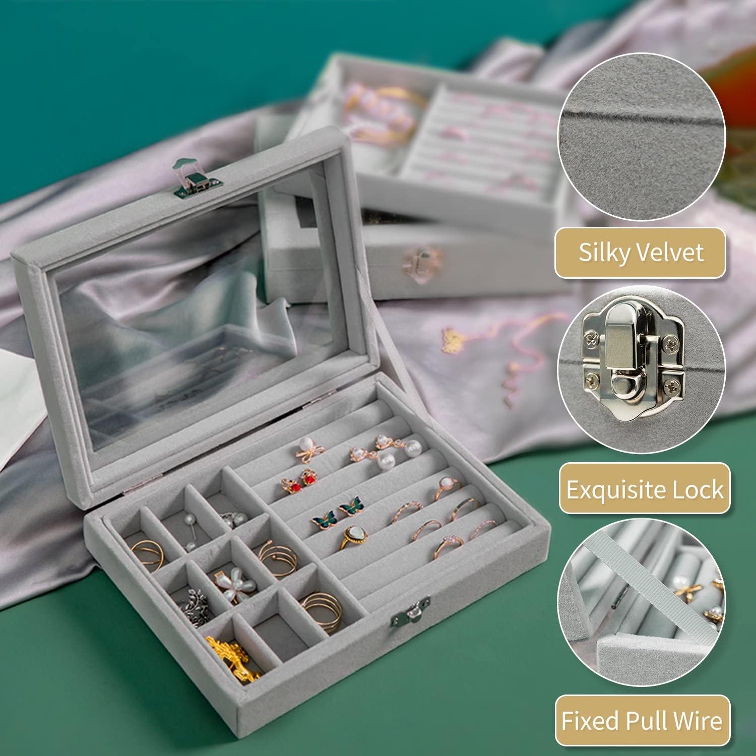 - Material & Design: This earrings Tray Showcase is made up of sturdy cardboard material with a smooth velvet finish and the transparent part of the product is acrylic. This product comes with 2 buckle locks for protection. It has rows and compartments for studs, earrings, and rings. There is also a presence of a satin ribbon which holds and acts as a balance in between the top and bottom of the box.