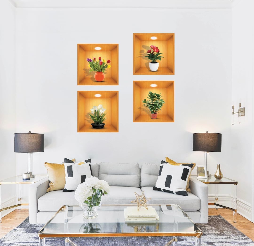 Giftock 3D Flower Wall Sticker - 4 Pcs New Creative Simulation Green Plant Pot Stickers, Self Adhesive Waterproof Wall Paper Decorative Stickers